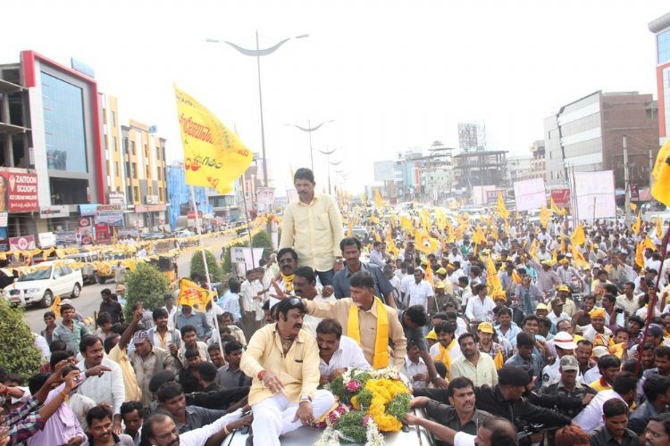 TDP president N Chandrababu Naidu being taken in a procession from the airport at Shamshabad in Hyderabad on Sunday.