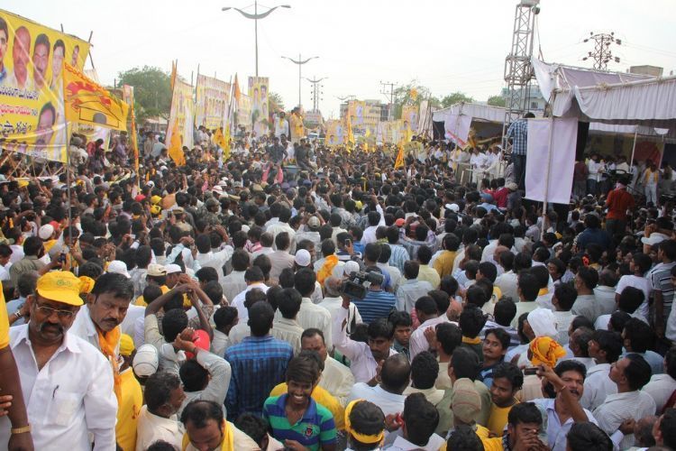 TDP president N Chandrababu Naidu being taken in a procession from the airport at Shamshabad in Hyderabad on Sunday.