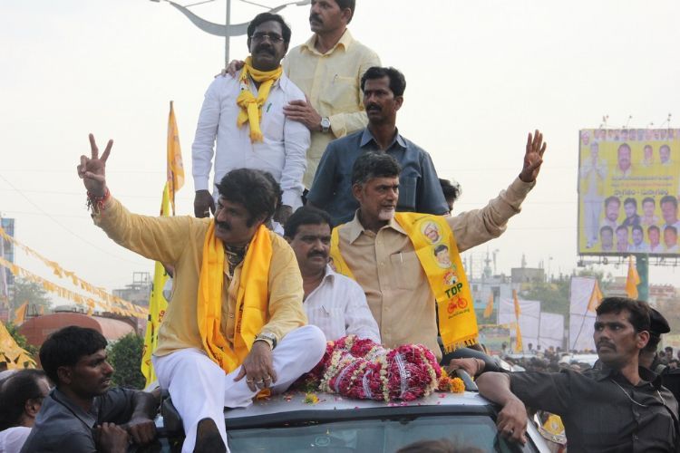 TDP president N Chandrababu Naidu being taken in a procession from the airport at Shamshabad in Hyderabad on Sunday.