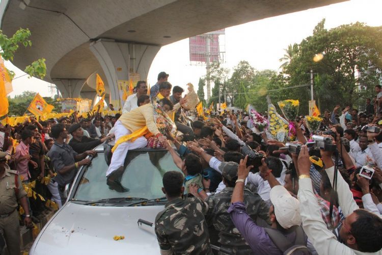 TDP president N Chandrababu Naidu being taken in a procession from the airport at Shamshabad in Hyderabad on Sunday.