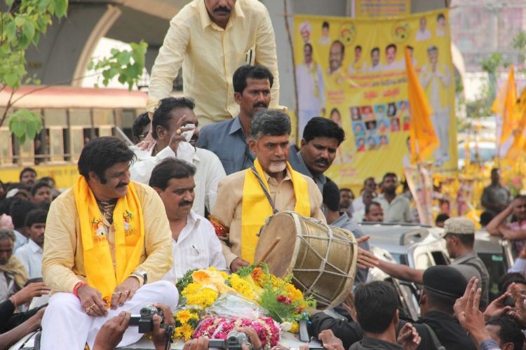TDP president N Chandrababu Naidu being taken in a procession from the airport at Shamshabad in Hyderabad on Sunday.