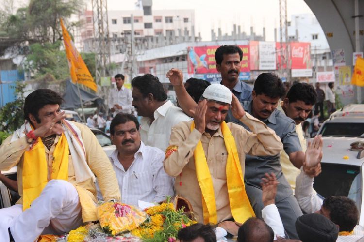 TDP president N Chandrababu Naidu being taken in a procession from the airport at Shamshabad in Hyderabad on Sunday.