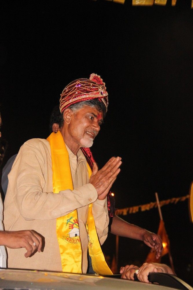 TDP president N Chandrababu Naidu being taken in a procession from the airport at Shamshabad in Hyderabad on Sunday.