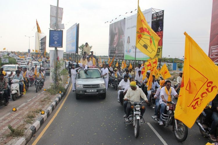 TDP president N Chandrababu Naidu being taken in a procession from the airport at Shamshabad in Hyderabad on Sunday.