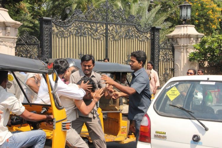 This is no act: Bodyguards of actor Ram Charan Tej, son of Union Minister Chiranjeevi, assaulting software engineers — Phanish (whose shirt is torn) and Kalyan (who is being kicked) — for reportedly not giving way to the actor's Aston Martin at a free left turnnear a traffic junction in Banjara Hills on Sunday afternoon.