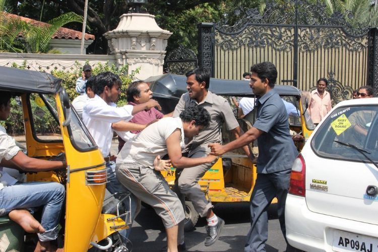 This is no act: Bodyguards of actor Ram Charan Tej, son of Union Minister Chiranjeevi, assaulting software engineers — Phanish (whose shirt is torn) and Kalyan (who is being kicked) — for reportedly not giving way to the actor's Aston Martin at a free left turnnear a traffic junction in Banjara Hills on Sunday afternoon.