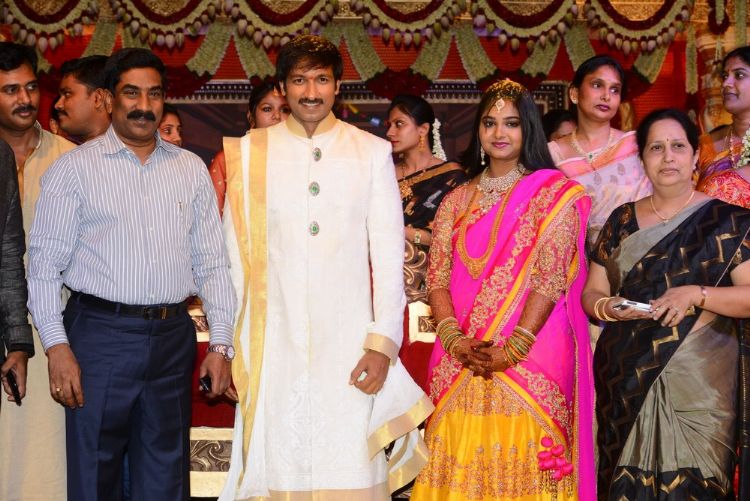 Actor Gopichand's wedding celebrations kicked off on Saturday and went on till Sunday evening at N Convention in Hyderabad. His close friends and those from the film fraternity have greeted Gopichand and his new bride Reshma. Actors Pawan Kalyan, Ravi Teja and a host of leader stars graced the celebrations.