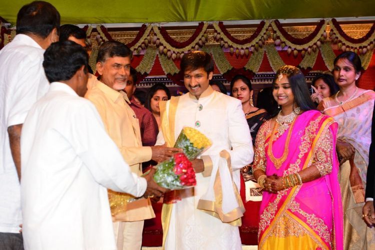 Actor Gopichand's wedding celebrations kicked off on Saturday and went on till Sunday evening at N Convention in Hyderabad. His close friends and those from the film fraternity have greeted Gopichand and his new bride Reshma. Actors Pawan Kalyan, Ravi Teja and a host of leader stars graced the celebrations.