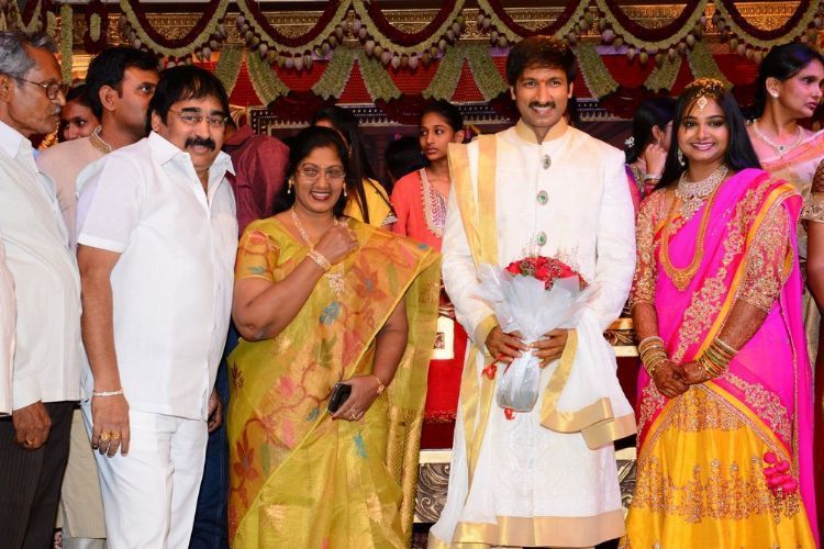 Actor Gopichand's wedding celebrations kicked off on Saturday and went on till Sunday evening at N Convention in Hyderabad. His close friends and those from the film fraternity have greeted Gopichand and his new bride Reshma. Actors Pawan Kalyan, Ravi Teja and a host of leader stars graced the celebrations.