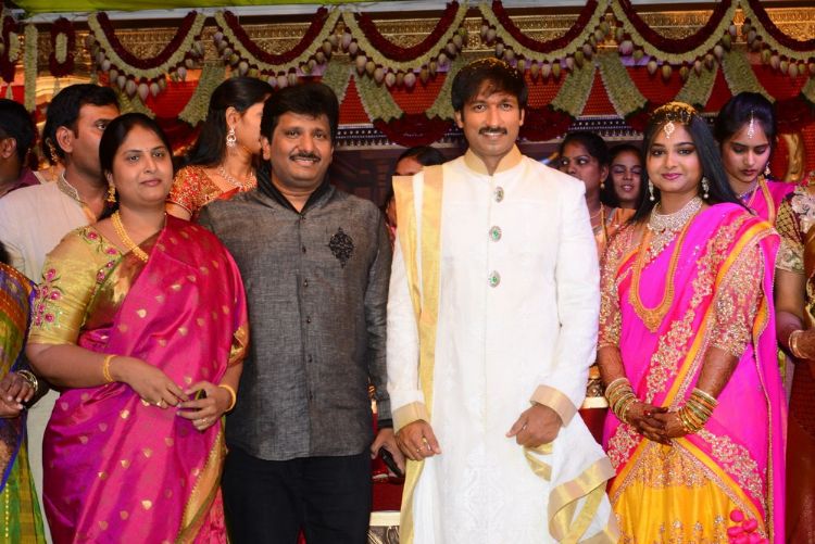 Actor Gopichand's wedding celebrations kicked off on Saturday and went on till Sunday evening at N Convention in Hyderabad. His close friends and those from the film fraternity have greeted Gopichand and his new bride Reshma. Actors Pawan Kalyan, Ravi Teja and a host of leader stars graced the celebrations.