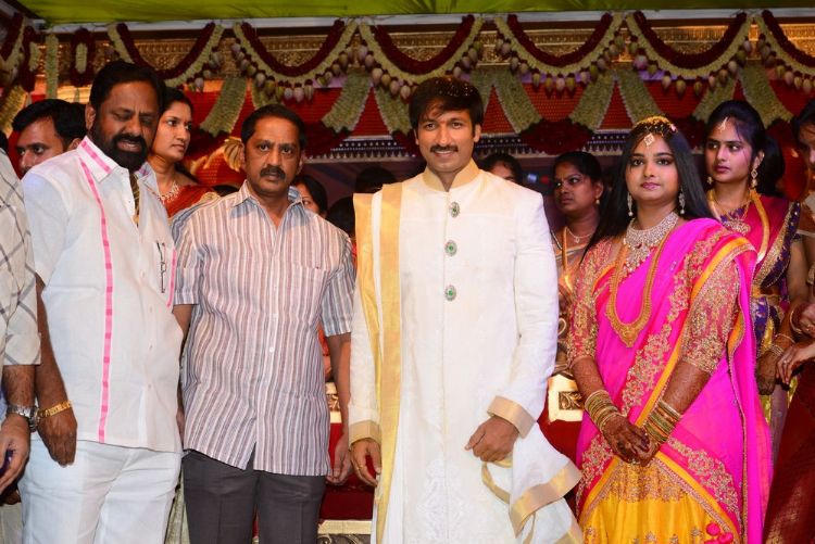 Actor Gopichand's wedding celebrations kicked off on Saturday and went on till Sunday evening at N Convention in Hyderabad. His close friends and those from the film fraternity have greeted Gopichand and his new bride Reshma. Actors Pawan Kalyan, Ravi Teja and a host of leader stars graced the celebrations.