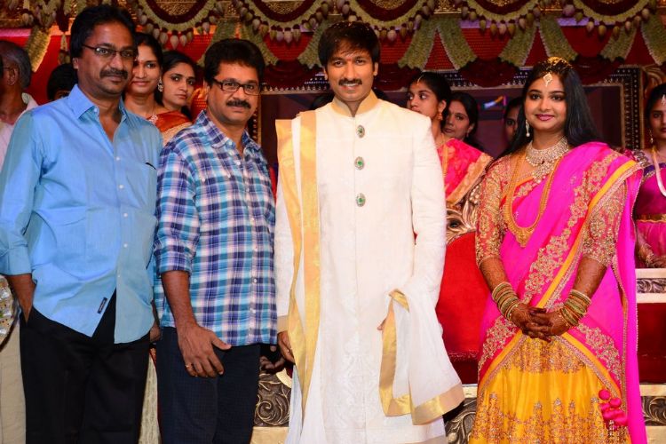 Actor Gopichand's wedding celebrations kicked off on Saturday and went on till Sunday evening at N Convention in Hyderabad. His close friends and those from the film fraternity have greeted Gopichand and his new bride Reshma. Actors Pawan Kalyan, Ravi Teja and a host of leader stars graced the celebrations.