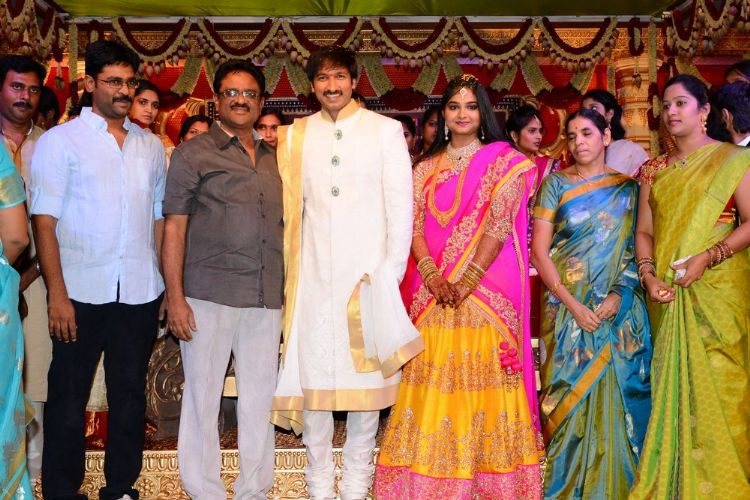 Actor Gopichand's wedding celebrations kicked off on Saturday and went on till Sunday evening at N Convention in Hyderabad. His close friends and those from the film fraternity have greeted Gopichand and his new bride Reshma. Actors Pawan Kalyan, Ravi Teja and a host of leader stars graced the celebrations.