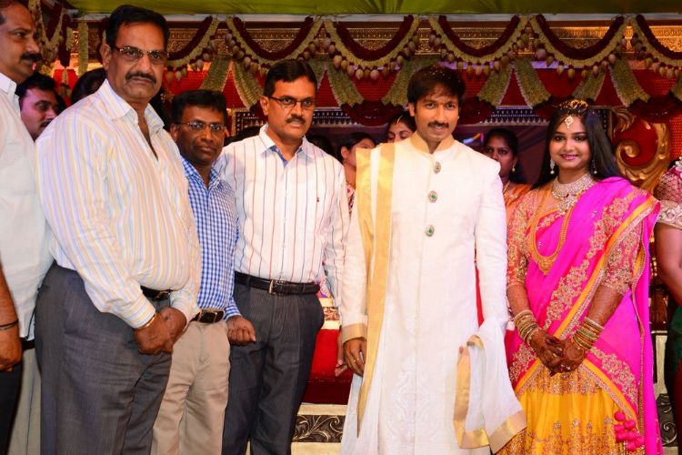 Actor Gopichand's wedding celebrations kicked off on Saturday and went on till Sunday evening at N Convention in Hyderabad. His close friends and those from the film fraternity have greeted Gopichand and his new bride Reshma. Actors Pawan Kalyan, Ravi Teja and a host of leader stars graced the celebrations.