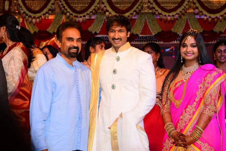 Actor Gopichand's wedding celebrations kicked off on Saturday and went on till Sunday evening at N Convention in Hyderabad. His close friends and those from the film fraternity have greeted Gopichand and his new bride Reshma. Actors Pawan Kalyan, Ravi Teja and a host of leader stars graced the celebrations.