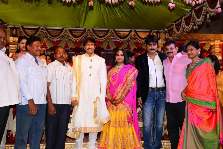 Actor Gopichand's wedding celebrations kicked off on Saturday and went on till Sunday evening at N Convention in Hyderabad. His close friends and those from the film fraternity have greeted Gopichand and his new bride Reshma. Actors Pawan Kalyan, Ravi Teja and a host of leader stars graced the celebrations.