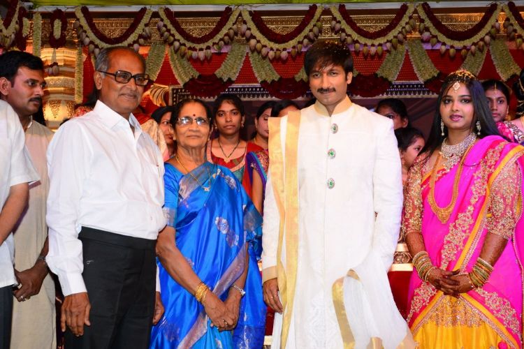 Actor Gopichand's wedding celebrations kicked off on Saturday and went on till Sunday evening at N Convention in Hyderabad. His close friends and those from the film fraternity have greeted Gopichand and his new bride Reshma. Actors Pawan Kalyan, Ravi Teja and a host of leader stars graced the celebrations.