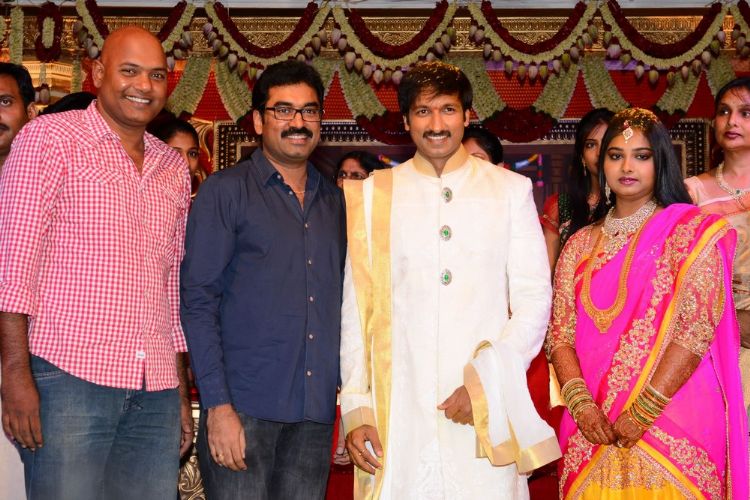Actor Gopichand's wedding celebrations kicked off on Saturday and went on till Sunday evening at N Convention in Hyderabad. His close friends and those from the film fraternity have greeted Gopichand and his new bride Reshma. Actors Pawan Kalyan, Ravi Teja and a host of leader stars graced the celebrations.