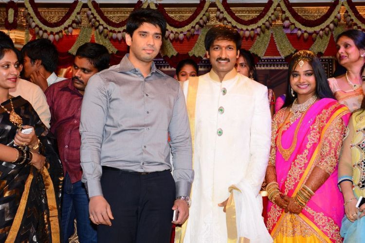 Actor Gopichand's wedding celebrations kicked off on Saturday and went on till Sunday evening at N Convention in Hyderabad. His close friends and those from the film fraternity have greeted Gopichand and his new bride Reshma. Actors Pawan Kalyan, Ravi Teja and a host of leader stars graced the celebrations.