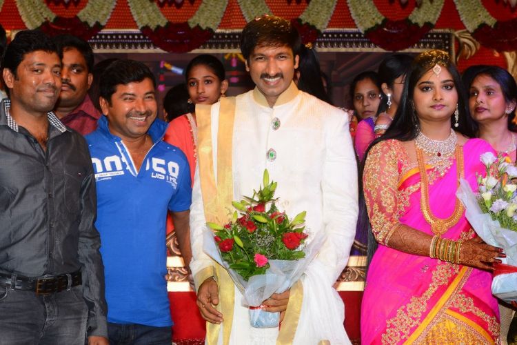 Actor Gopichand's wedding celebrations kicked off on Saturday and went on till Sunday evening at N Convention in Hyderabad. His close friends and those from the film fraternity have greeted Gopichand and his new bride Reshma. Actors Pawan Kalyan, Ravi Teja and a host of leader stars graced the celebrations.