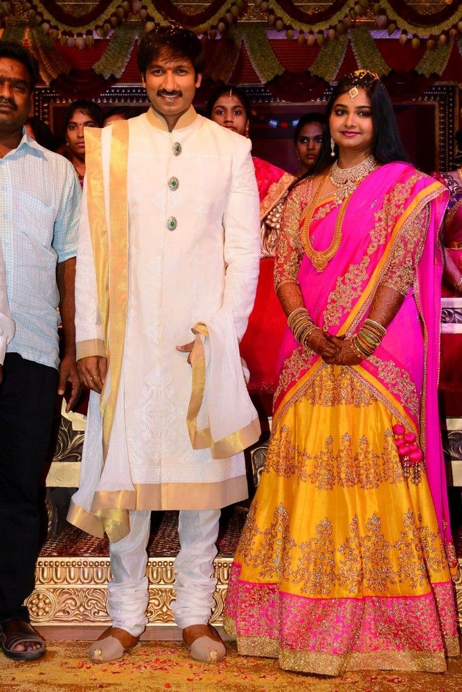 Actor Gopichand's wedding celebrations kicked off on Saturday and went on till Sunday evening at N Convention in Hyderabad. His close friends and those from the film fraternity have greeted Gopichand and his new bride Reshma. Actors Pawan Kalyan, Ravi Teja and a host of leader stars graced the celebrations.