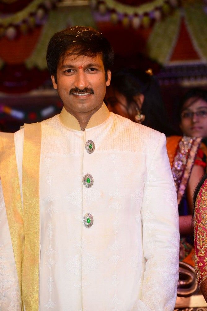Actor Gopichand's wedding celebrations kicked off on Saturday and went on till Sunday evening at N Convention in Hyderabad. His close friends and those from the film fraternity have greeted Gopichand and his new bride Reshma. Actors Pawan Kalyan, Ravi Teja and a host of leader stars graced the celebrations.