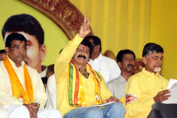 TDP president N Chandrababu Naidu and actor Balakrishna join other leaders in NTR Birth day celebrations in Mahanadu held at Gandipet.