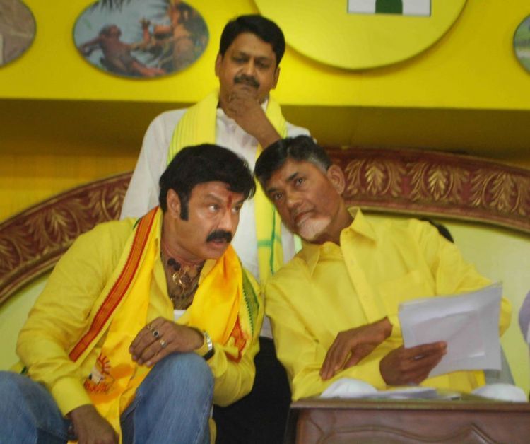 TDP president N Chandrababu Naidu and actor Balakrishna join other leaders in NTR Birth day celebrations in Mahanadu held at Gandipet.