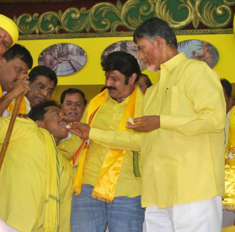 TDP president N Chandrababu Naidu and actor Balakrishna join other leaders in NTR Birth day celebrations in Mahanadu held at Gandipet.