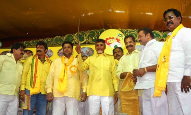 TDP president N Chandrababu Naidu and actor Balakrishna join other leaders in NTR Birth day celebrations in Mahanadu held at Gandipet.