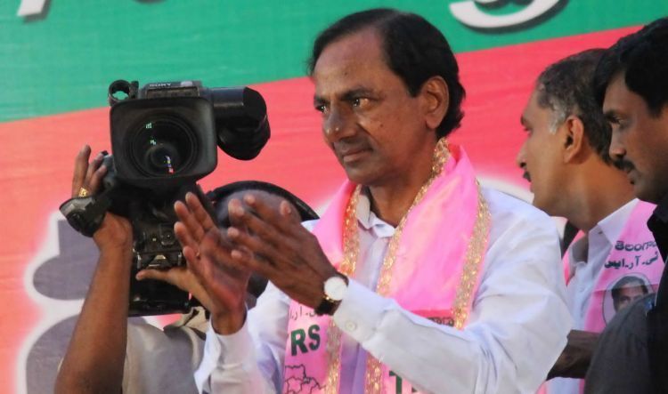 Congress leader K Kesava Rao, MPs G Vivek and Manda Jaganadham, former minister G Vinod formally joins TRS in the presence of TRS chief K Chandrasekhara Rao at a hugely attended public meeting held in Nizam College grounds here on Sunday.