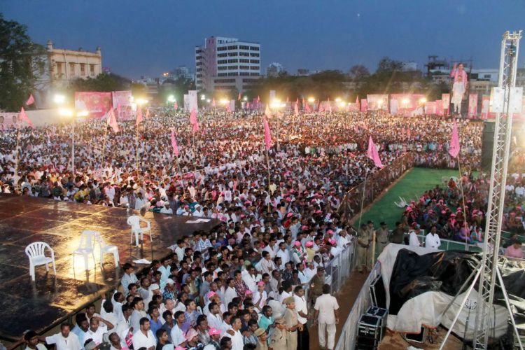 Congress leader K Kesava Rao, MPs G Vivek and Manda Jaganadham, former minister G Vinod formally joins TRS in the presence of TRS chief K Chandrasekhara Rao at a hugely attended public meeting held in Nizam College grounds here on Sunday.