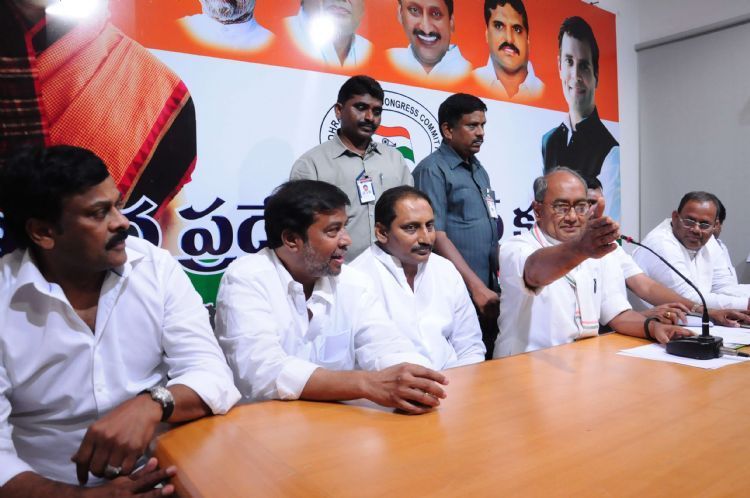 Congress Party A.P Incharge AICCI general secratry Mr Digvijay Singh along with cheif Minister Kiran kumar Reddy, and deputy Cheif minister Damodhar Rajnarsimha, Bothsa Satayanarayana APCCI president addressing Media at Gandhi Bhavan.