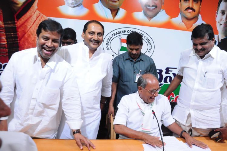Congress Party A.P Incharge AICCI general secratry Mr Digvijay Singh along with cheif Minister Kiran kumar Reddy, and deputy Cheif minister Damodhar Rajnarsimha, Bothsa Satayanarayana APCCI president addressing Media at Gandhi Bhavan.
