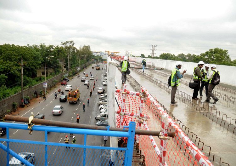 L & T Hyderabad Metro Rail MD V.B.Gadgil explaining to media persons the laying of viaducts for rails on the Nagole Mettuguda section at Hubsiguda in Hyderabad on Friday.