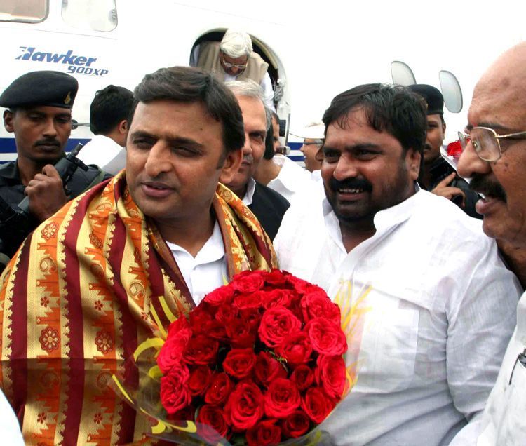 Utter Pradesh Chief Minister Akilesh Singh Yadav arrives to a rousing welcome at Begumpet Airport in Hyderabad on Saturday.