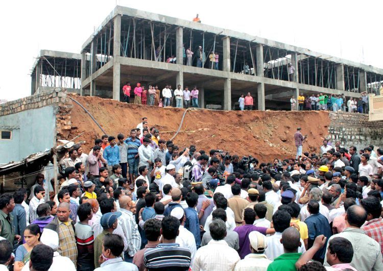 Six people, including two children died in the Moula Ali area on the outskirts of Hyderabad after a wall collapsed on their make shift huts early Tuesday. Rescue workers pulled out two people from the debris.
