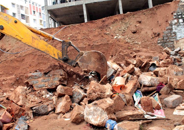 Six people, including two children died in the Moula Ali area on the outskirts of Hyderabad after a wall collapsed on their make shift huts early Tuesday. Rescue workers pulled out two people from the debris.