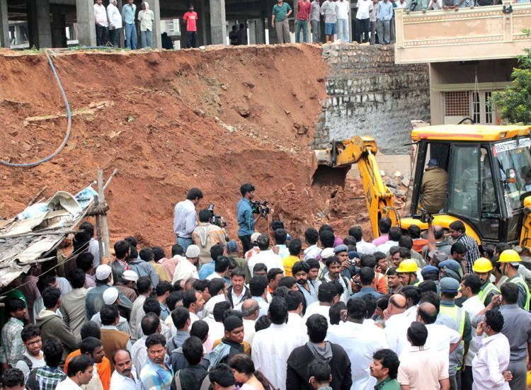 Six people, including two children died in the Moula Ali area on the outskirts of Hyderabad after a wall collapsed on their make shift huts early Tuesday. Rescue workers pulled out two people from the debris.