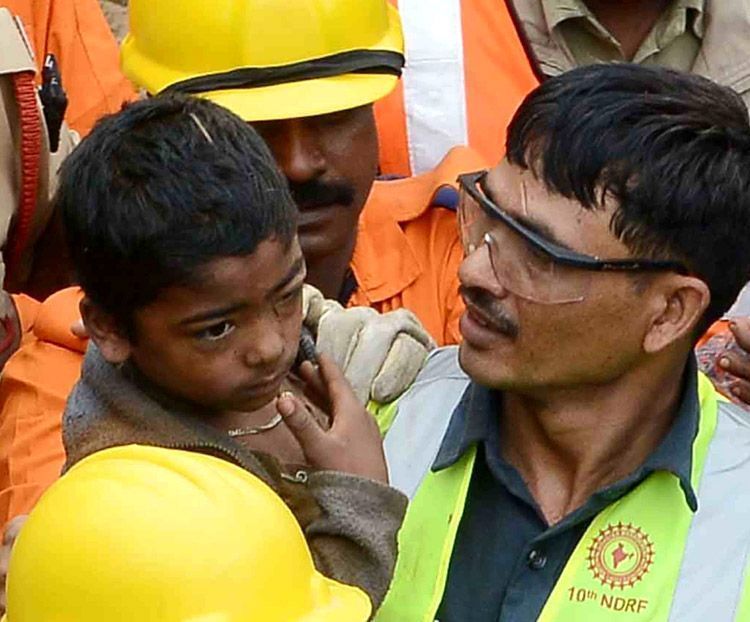 A boy being rescued alive by a rescue team member from the debris of wall collapse mishap in Moula Ali on the outskirts of Hyderabad on Tuesday. Six people from two families buried alive under the debris when a retaining wall came crashing down on the huts adjecent to it.