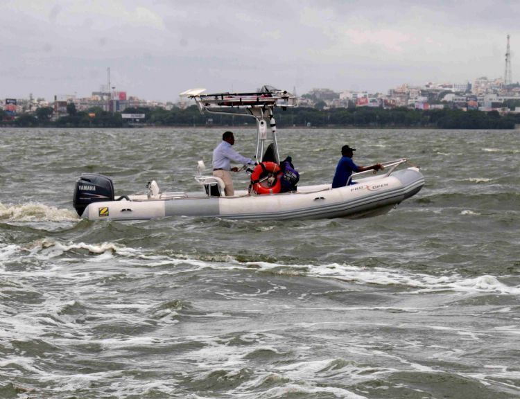 A business man tows his speed boat to Hussain Sagar for a joy ride in the swirling waters of the lake. Hussain Sagar was full to the brim with, thanks to recent rains.