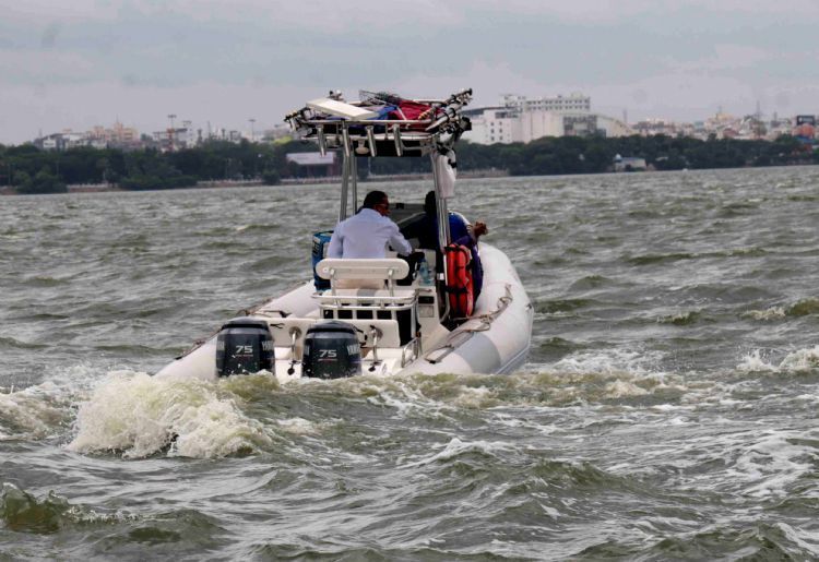 A business man tows his speed boat to Hussain Sagar for a joy ride in the swirling waters of the lake. Hussain Sagar was full to the brim with, thanks to recent rains.