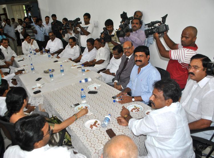Seemandhra ministers after a brainstorming meeting at Minister's quarters in Banjara Hills here on Wednesday speaking to media persons. The ministers have also served a veiled threat to party top brass against any move on dividing the state.