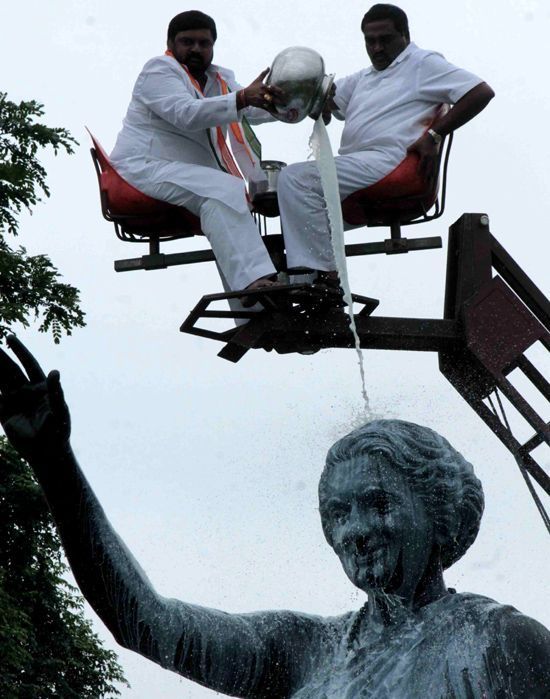Congress MP Anjan Kumar Yadav consecrating Indira Gandhi statue in Hyderabad on Monday.