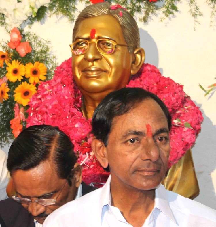 TRS president K. Chandrasekhar Rao pays tributes to Telangana Idealouge Prof. Jayashankar at Telangana Bhavan in Hyderabad on Tuesday.