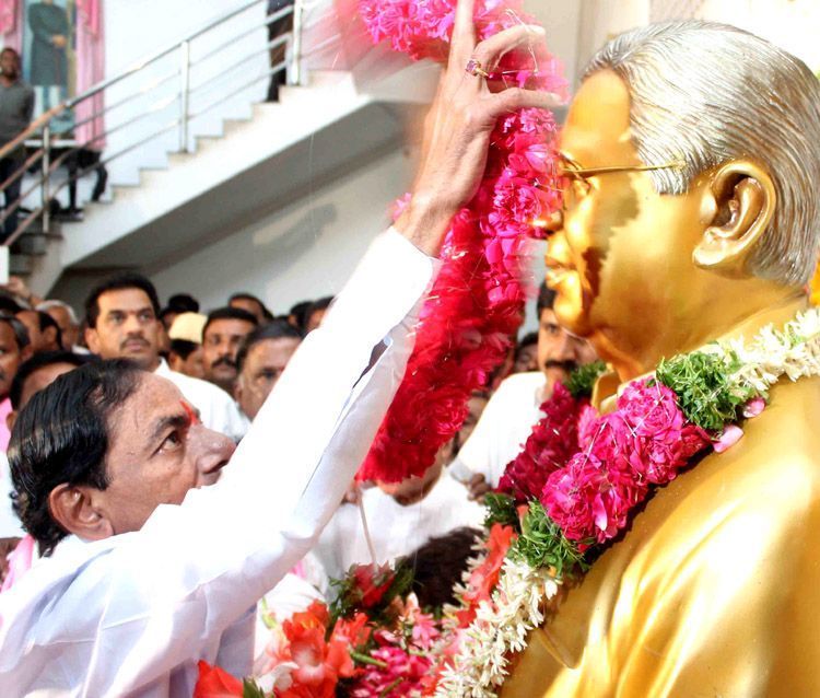 TRS president K. Chandrasekhar Rao pays tributes to Telangana Idealouge Prof. Jayashankar at Telangana Bhavan in Hyderabad on Tuesday.