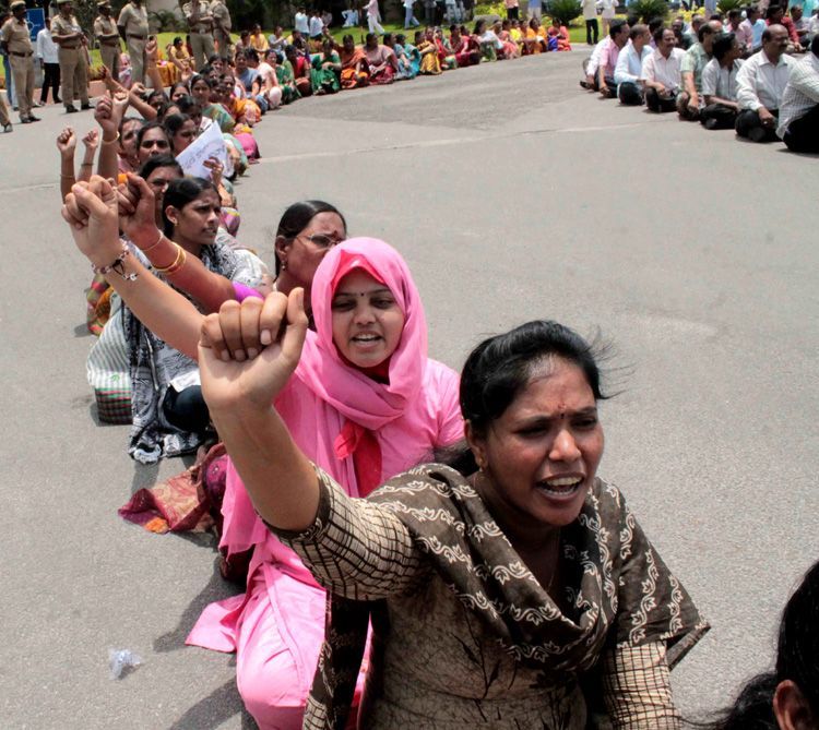 Andhra employees of AP secretariat staging a sit in protest in the secretariat premises on Wednesday in Hyderabad demanding to roll back decision to divide the state.