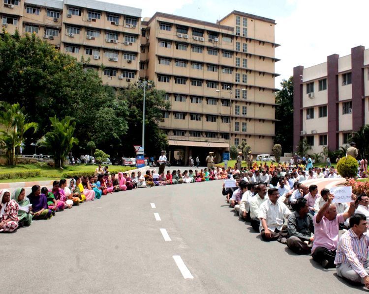Andhra employees of AP secretariat staging a sit in protest in the secretariat premises on Wednesday in Hyderabad demanding to roll back decision to divide the state.