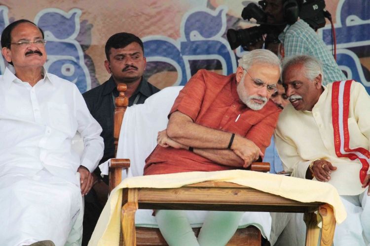 BJP's national election campaign chief Narendra Modi addressing massive public meeting in Hyderabad at Lal Bahadur stadium on Sunday. AP state BJP president Kishan Reddy, former Union Minister Bandru Dattatreya, MP Venkaiah Naidu were present.