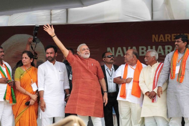 BJP's national election campaign chief Narendra Modi addressing massive public meeting in Hyderabad at Lal Bahadur stadium on Sunday. AP state BJP president Kishan Reddy, former Union Minister Bandru Dattatreya, MP Venkaiah Naidu were present.